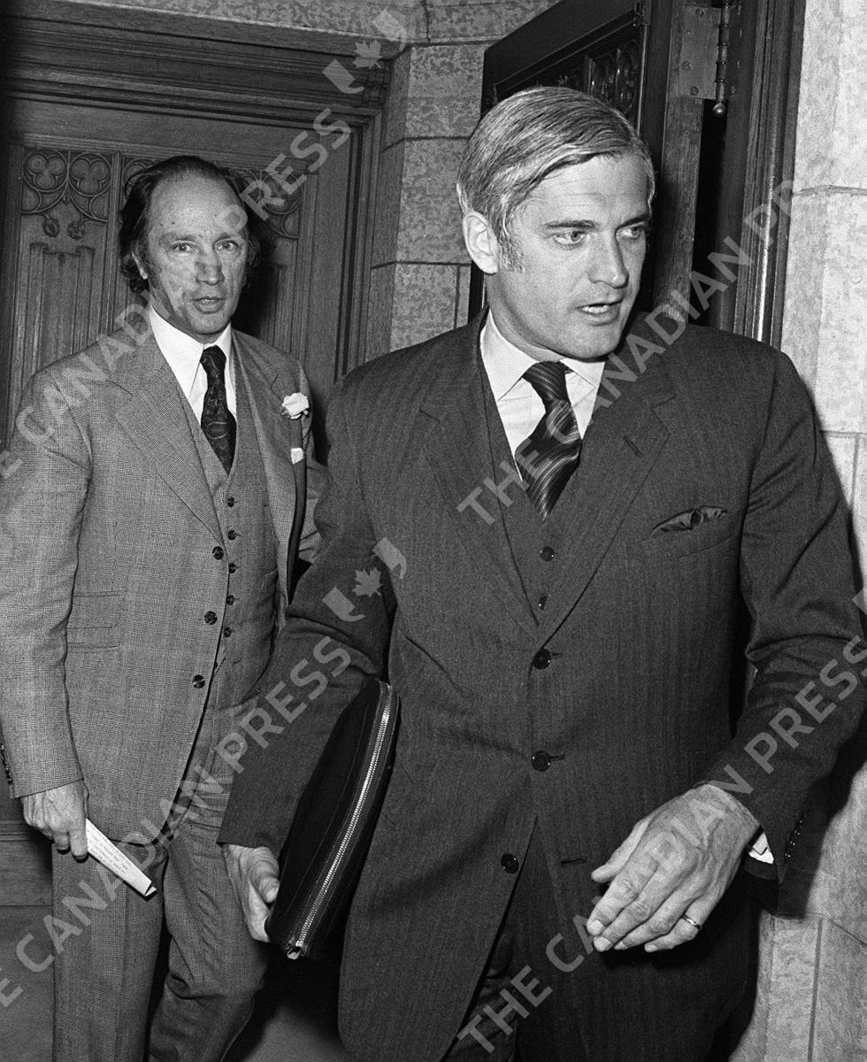 Prime Minister Trudeau stands in the background as Finance Minister John Turner heads to the House of Commons May 8, 1972 to present his first budget. (CP PHOTO/Peter Bregg)