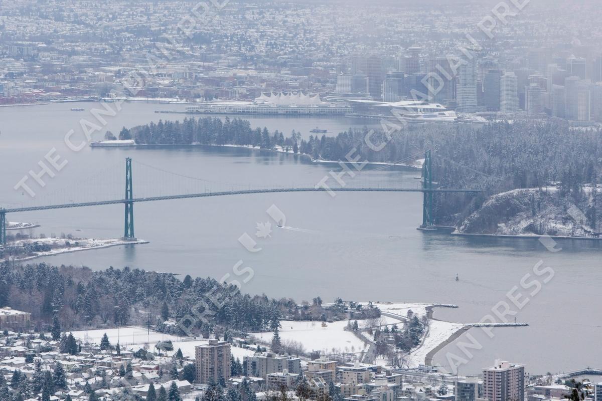 The Lions Gate bridge can be seen as nearly 10 centimeters cover downtown Vancouver, B.C. Sunday, Dec. 14, 2008. Unseasonably cold temperatures have gripped the lower mainland turning the normal rainfall into snow. THE CANADIAN PRESS/Jonathan Hayward