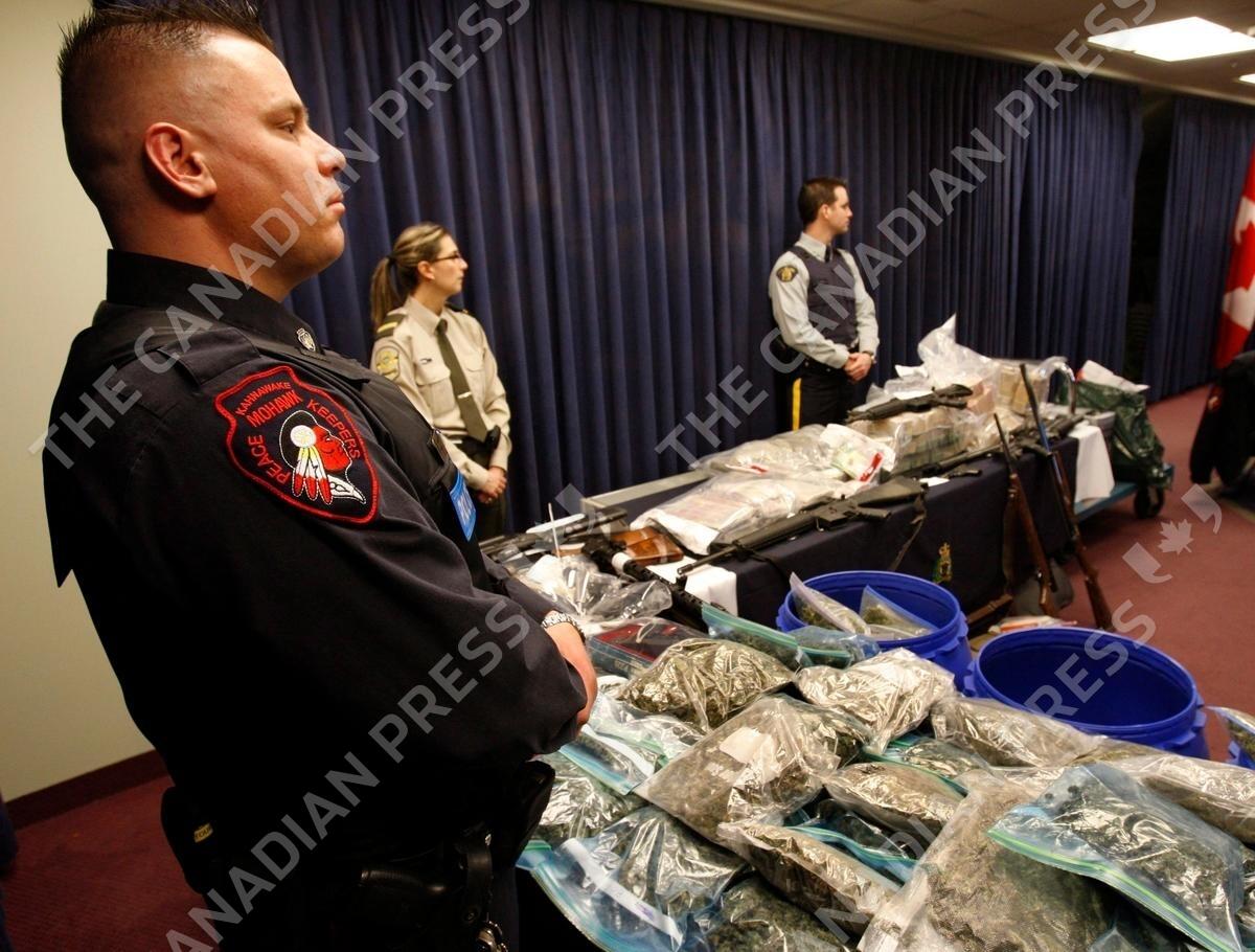 FILE-- A native Kahnawake police officer stands with SQ and RCMP officers with confiscated drugs, weapons and cash in Montreal in this March 26, 2008 file photo. A joint squad of RCMP, Quebec provincial police and aboriginal police officers is fighting organized crime in native communities and helping boost the skills of aboriginal cops. THE CANADIAN PRESS/Ryan Remiorz