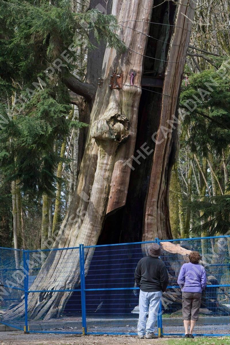 A couple look though a safety fence at Stanley Park's famous hollow tree in Stanley Park in Vancouver, Tuesday, April 1, 2008. The fate of the 1,100-year-old red cedar tree was decided on Monday after members of the Vancouver park board voted to cut it down. The cedar has been battered over the years with the most recent being the wind storm that hit two years ago. THE CANADIAN PRESS/Jonathan Hayward