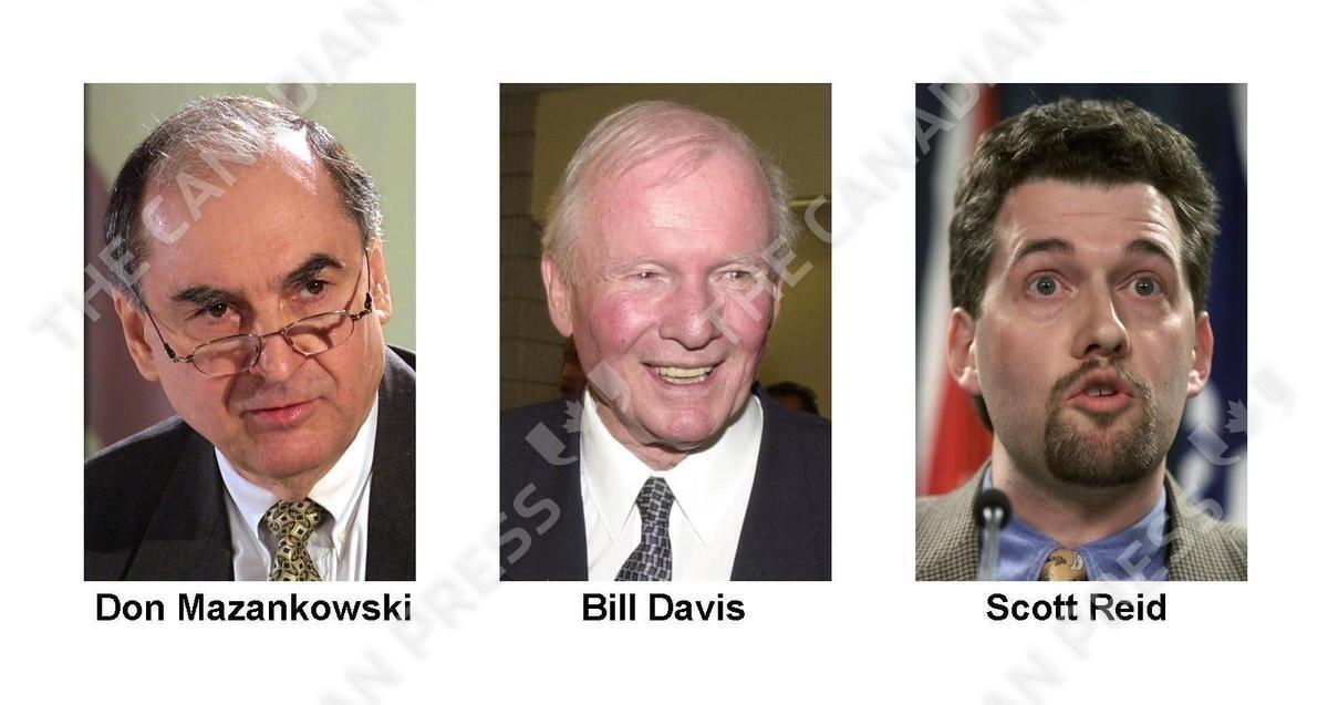 Former federal cabinet minister Don Mazankowski, former Ontario premier Bill Davis and Canadian Alliance MP Scott Reid are shown in these recent file photos.Depending on who you talk to, the Tory-Alliance courtship is either on the verge of marriage or a tumultuous breakup. The Canadian Alliance says only one key sticking point remains, but some Conservative MPs say they want no part of any merger. (CP PICTURE ARCHIVE)