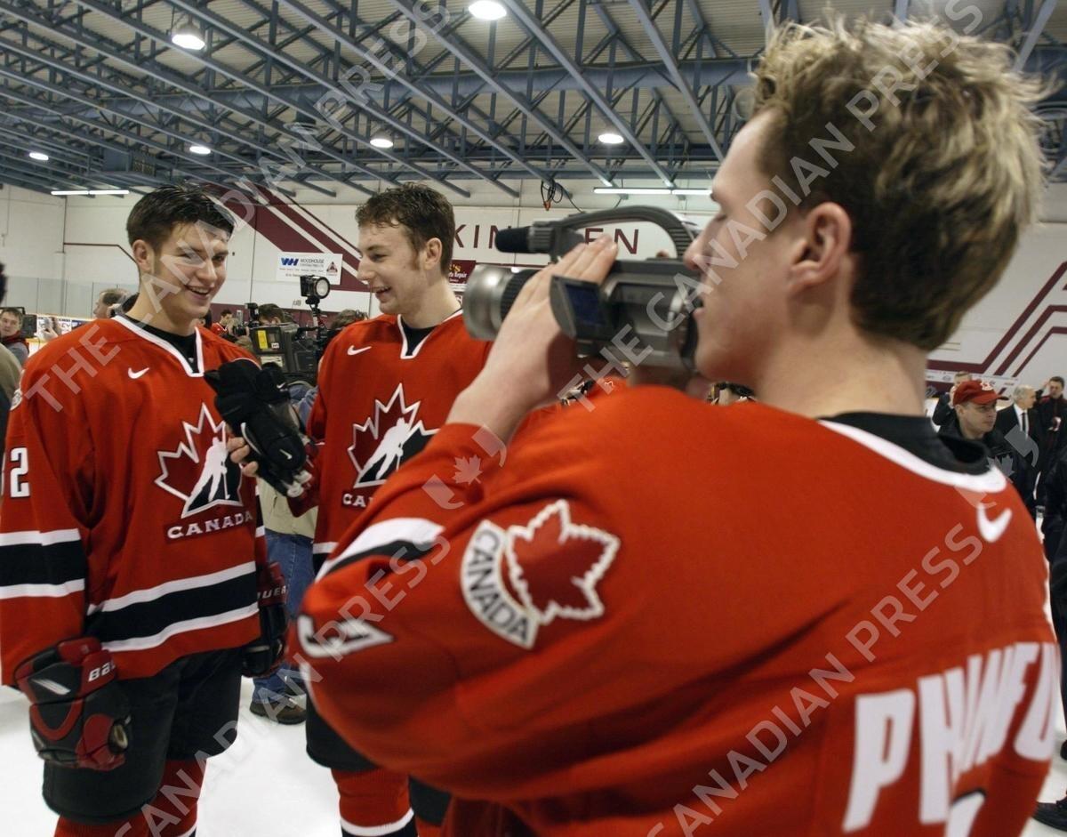 Canadian National Junior Hockey team member Dion Phaneuf (right) films teammate Braydon Coburn (centre) as he jokes about interviewing Brent Seabrook (left) following the official team photo in Kitchener, Ont., Tuesday Dec.16, 2003. (CP PHOTO/Adrian Wyld)