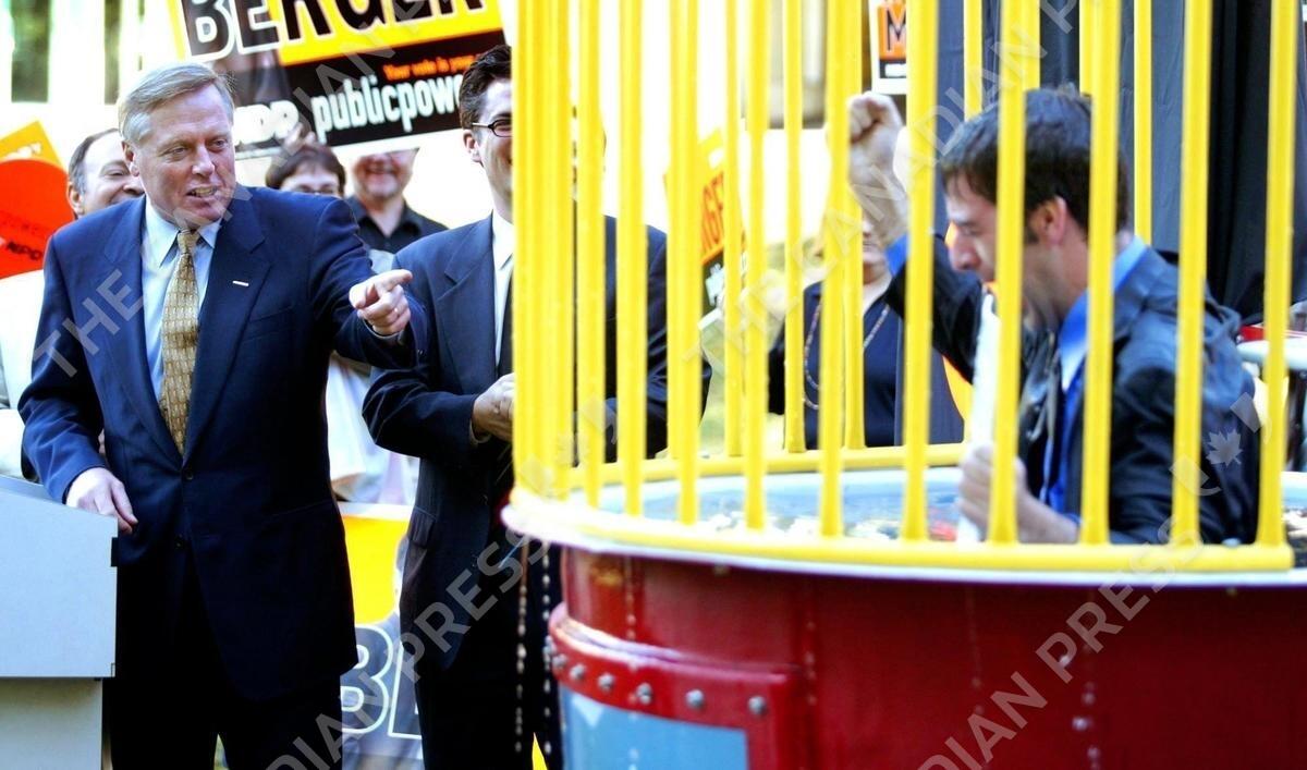 Ontario NDP Leader Howard Hampton points to a man representing private auto insurance companies after "dunking" him in a tank during a campaign stop in Dufferin Grove Park in Toronto, Tuesday, Sept.16, 2003. (CP PHOTO/Tobin Grimshaw)