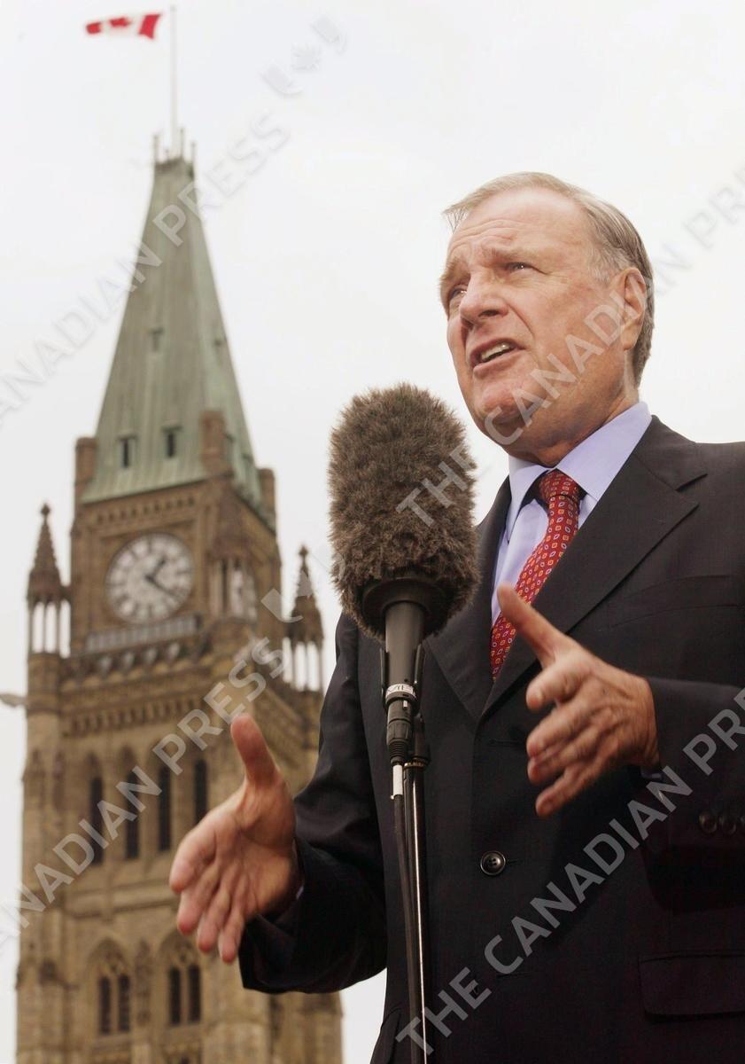 Liberal leadership candidate Paul Martin addresses a news conference on Parliament Hill in Ottawa Monday, Sept. 22, 2003. A day after effectively securing his place as the next prime minister, Paul Martin promised a "fundamental shift" in government to make it more democratic. (CP PHOTO/Jonathan Hayward)