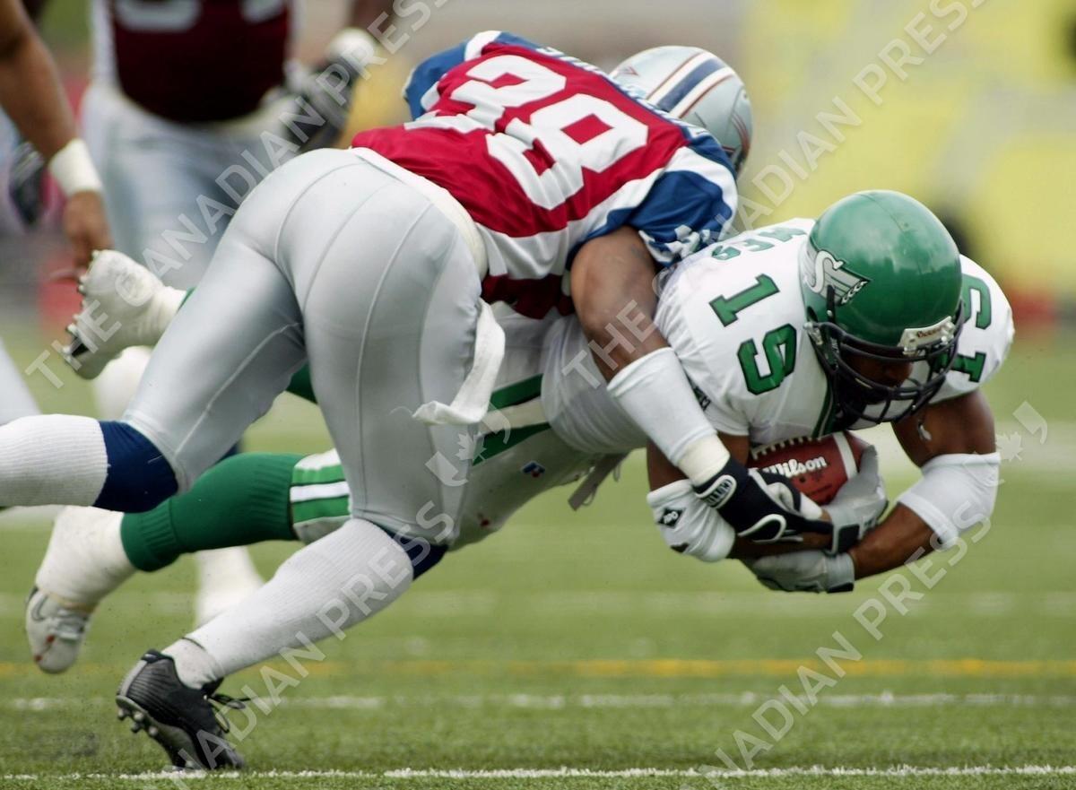 Saskatchewan Roughriders Corey Holmes is tackled by Montreal Alouettes line backer Timothy Strickland during first quarter CFL action Sunday, Sept. 21, 2003. The Alouettes beat the Roughriders 28-23. (CP PHOTO/Paul Chiasson)