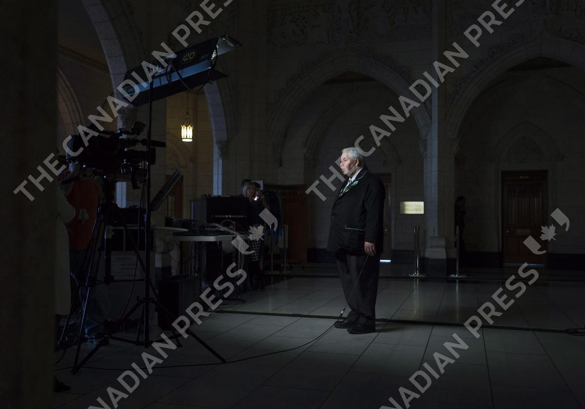 Senator Murray Sinclair takes part in a television interview in the foyer of the House of Commons on April 12, 2016 in Ottawa. Former Truth and Reconciliation Commission chairman Murray Sinclair says a video featuring a Mountie interrogating a young Indigenous woman disclosing sexual abuse in B.C. foster care brings home in a "visceral way" a reality that Canadians should be shocked by and one that they need to see. The video was released publicly by APTN this week as a result of a court proceeding and has prompted political reaction including from the federal public safety minister, who called its contents "absolutely abhorrent." THE CANADIAN PRESS/Adrian Wyld