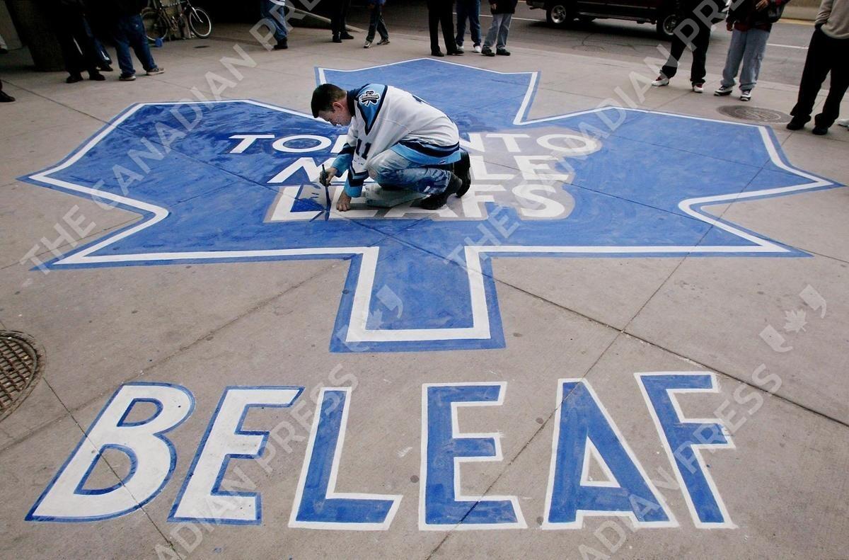 Artist Victor Fraser paints a Maple Leafs logo on the sidewalk outside the Air Canada Centre in Toronto Tuesday May 21,2002. The Maple Leafs play the Carolina Hurricanes in game three of the eastern conference final Tuesday night. (CP PHOTO/Kevin Frayer)
