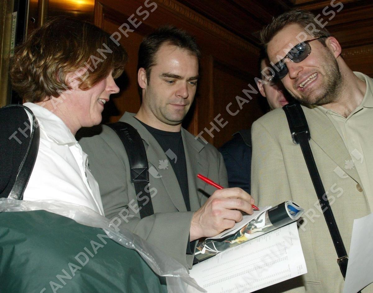 Toronto Maple Leafs goaltender Curtis Joseph (centre) signs an autograph for Leafs fan Debbie Zimmerman as Leafs Mikael Renberg (right) looks on as they arrive in Ottawa Sunday, May 5, 2002. The Leafs will take on the Ottawa Senators in game 3 of the Eastern Conference semifinal in Ottawa Monday, May 6, 2002. (CP PHOTO/Jonathan Hayward)