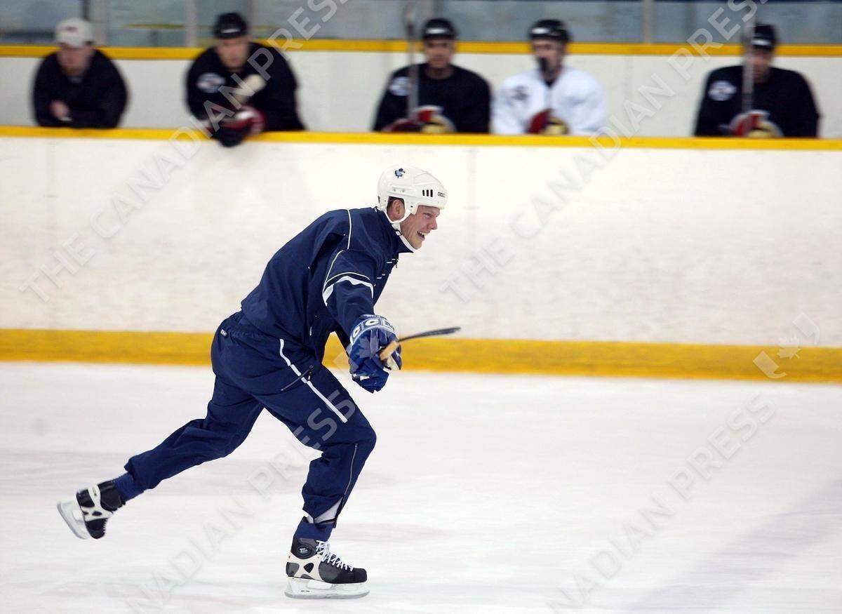 Members of the Ottawa Senators sit in the bench as Toronto Maple Leafs centre Mats Sundin skate drills at the end of a team practice in Toronto on Friday May 3, 2002. (CP PHOTO/Frank Gunn)