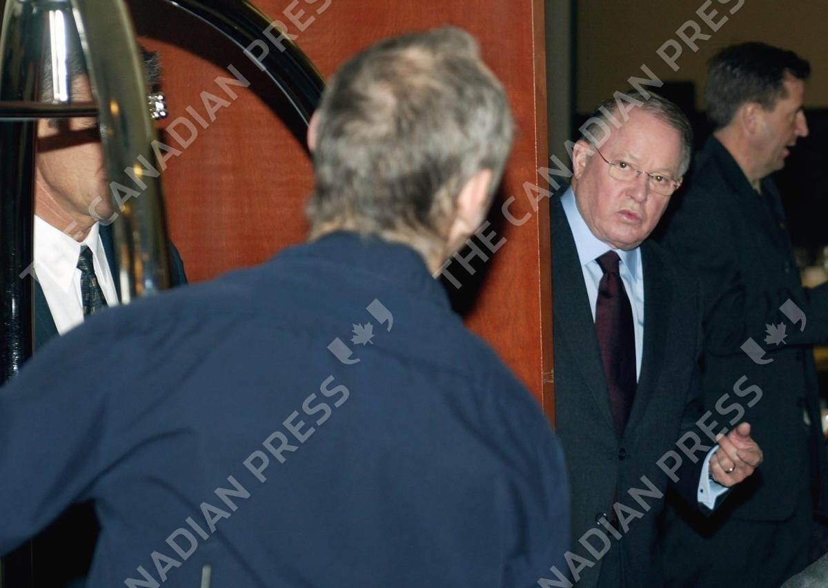 Quebec Premier Bernard Landry steps aside to let a hotel janitor enter the meeting room a two-day caucus meeting of Parti Quebecois MNA's and candidates Friday, Feb. 28, 2003 in Shawinigan, Que. Quebecers are expected to go to the polls this spring. (CP PHOTO/Paul Chiasson)