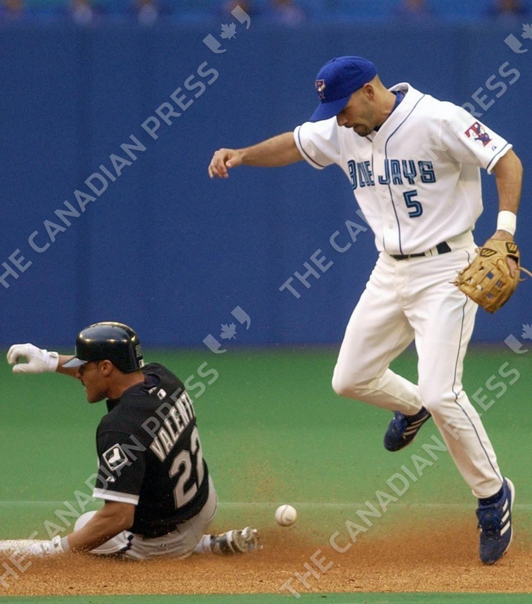 Toronto Blue Jays shortstop Chris Woodward, right, drops the ball after tagging out Chicago White Sox's Jose Valentin during second inning AL action in Toronto Wednesday July 23, 2003. White Sox Joe Crede was safe at first base. (CP PHOTO/Aaron Harris)