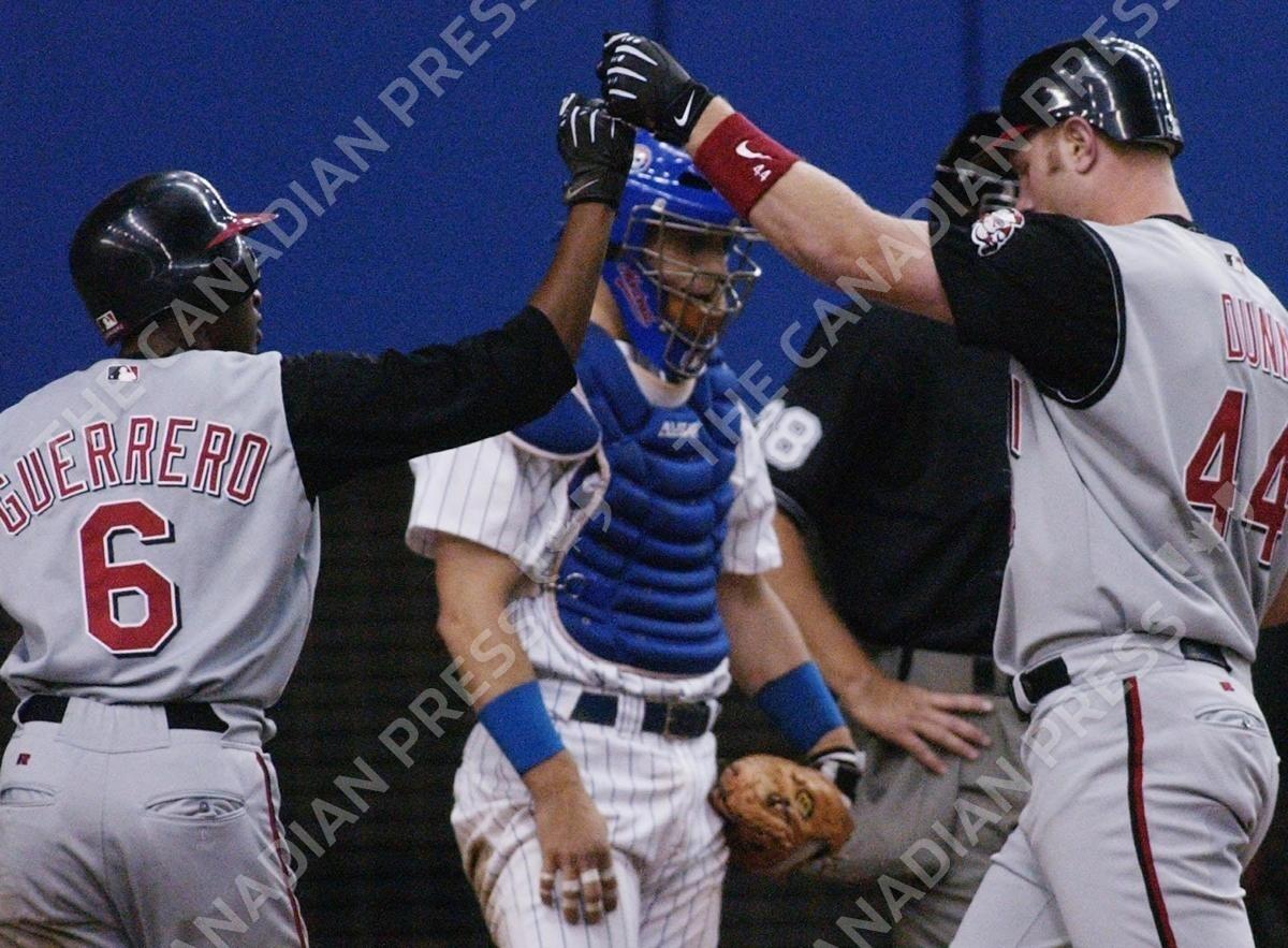 Cincinnati Reds Wilton Guerrero congratulates teammate Adam Dunn on a two run homerun as Montreal Expos Michael Barrett looks on during 5th inning NL action August 25, 2001, in Montreal. (CP PHOTO/Marcos Townsend)