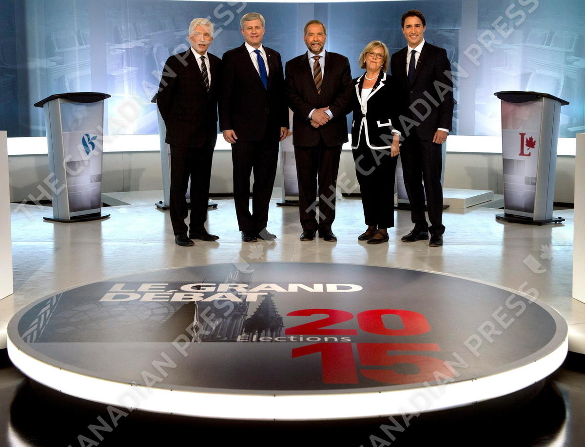 Bloc Quebecois Leader Gilles Duceppe, from left to right, Conservative Leader Stephen Harper, NDP Leader Tom Mulcair, Green party Leader Elizabeth May and Liberal Leader Justin Trudeau pose for photos before the French-language leaders' debate in Montreal on September 24, 2015. Televised leaders' debates during the coming federal election campaign should be more accessible, more civil and more educational for voters trying to make an informed choice. That at least was the advice of some 45 individuals and groups consulted by David Johnston, the former governor general who heads up Canada's first-ever leaders' debates commission. THE CANADIAN PRESS/Adrian Wyld