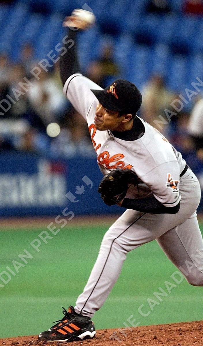 Baltimore Orioles' pitcher Rodrigo Lopez delivers a pitch against the Toronto Blue Jays during third inning AL action in Toronto Wednesday Sept. 25, 2002. (CP PHOTO/Aaron Harris)