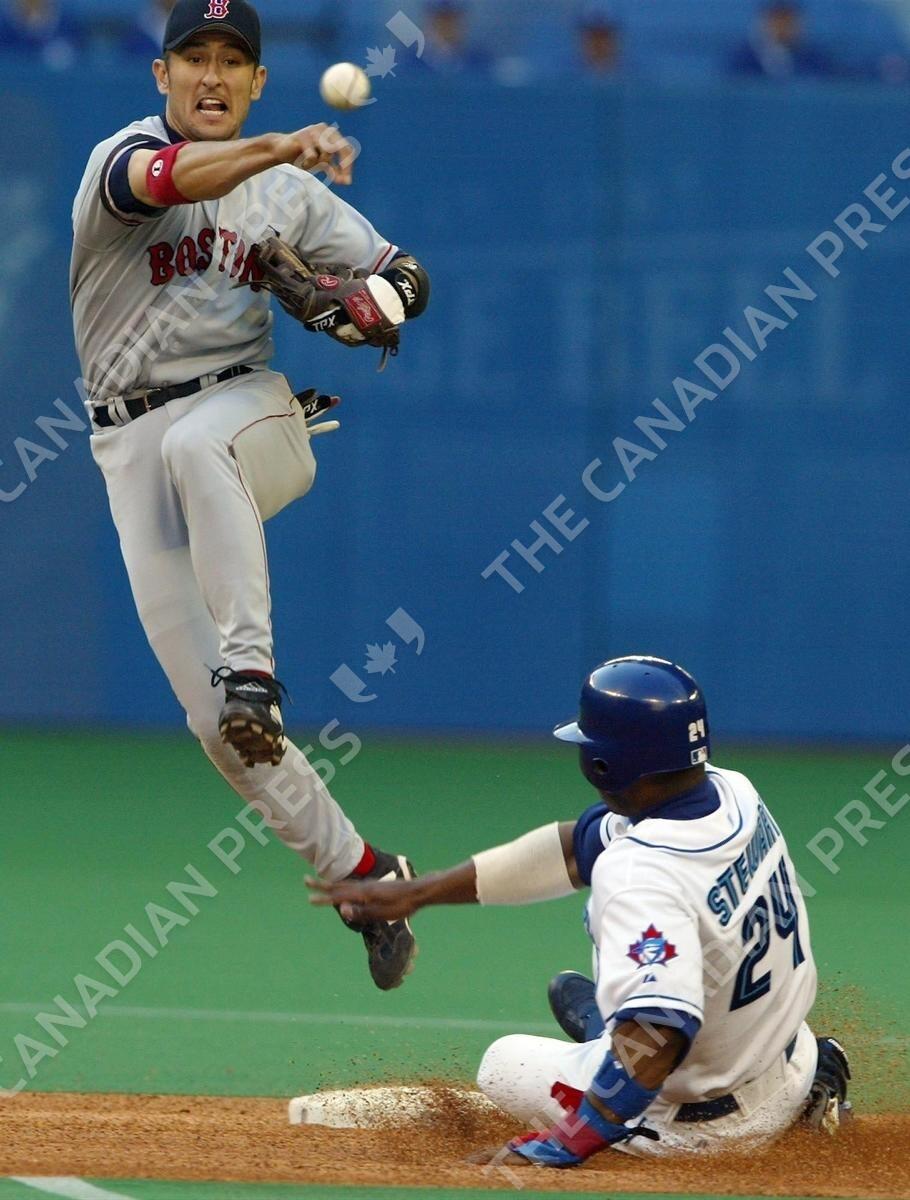 Boston Red Sox Nomar Garciaparra turns the double play on Toronto Blue Jays Shannon Stewart hit into by Jays Carlos Delgado during first inning AL action in Toronto on Thursday July 11, 2002. (CP PHOTO/Frank Gunn)