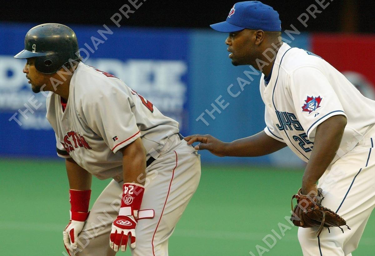 Toronto Blue Jays first baseman Carlos Delgado keeps close contact with Boston Red Sox Manny Ramirez during third inning AL action in Toronto on Thursday July 11, 2002. (CP PHOTO/Frank Gunn)