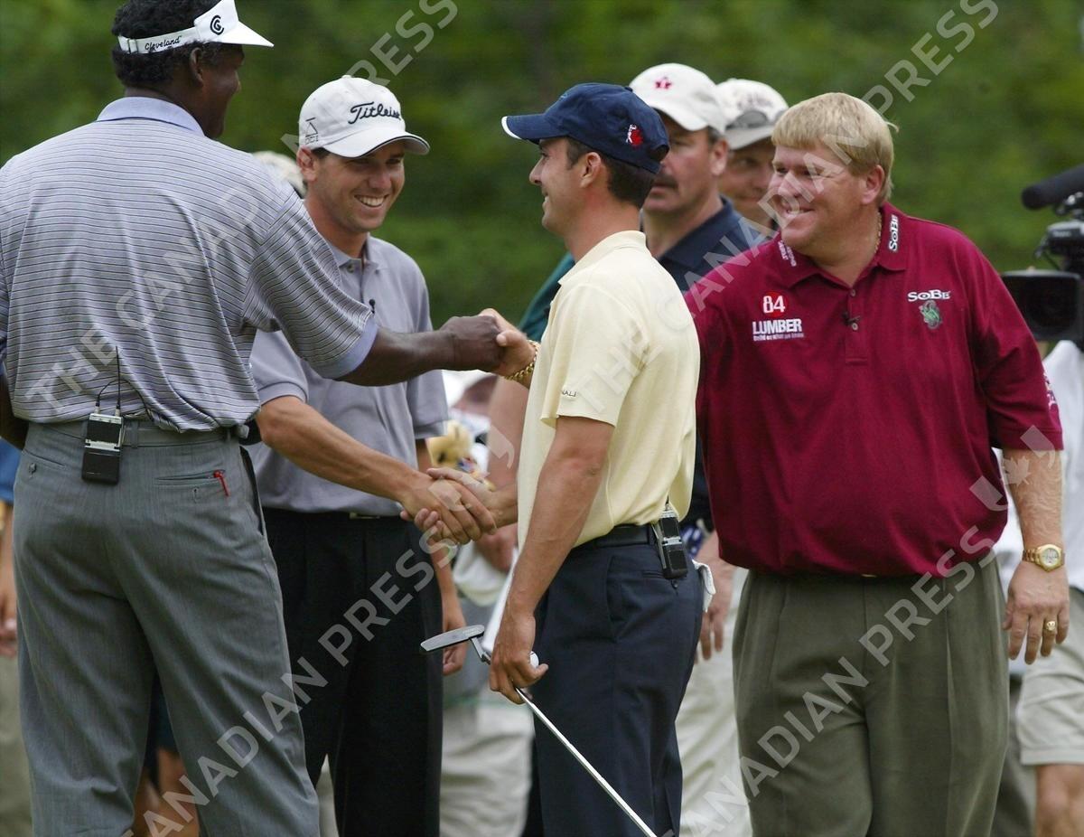 (Left to Right) Vijay Singh, Sergio Garcia, Mike Weir and John Daly shake hands following Telus Skins Game play at Grandview golf course in Huntsville, Ont., Monday June 24, 2002. Garcia and Weir were shut out with Daly taking home $60,000 and Singh $90,000. (CP PHOTO/Frank Gunn)