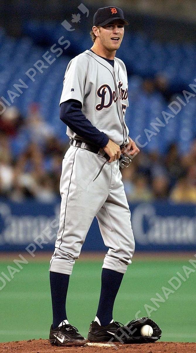 Detroit Tigers' pitcher Andy Van Hekken adjusts his belt after walking Toronto Blue Jays' Carlos Delgado to load the bases during the first inning of play in Toronto Friday Sept. 27, 2002. The Blue Jays beat the Tigers 5-2. (CP PHOTO/Aaron Harris)