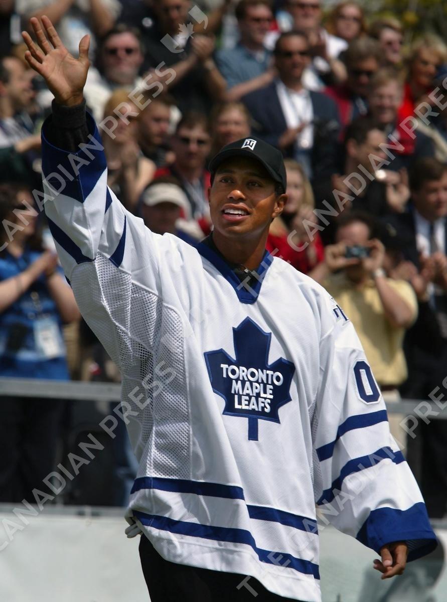 Tiger Woods waves while wearing a Toronto Maple Leafs jersey as he walks to his waiting helicopter following a golf exhibition in Toronto on Monday May 27, 2002. (CP PHOTO/Frank Gunn)