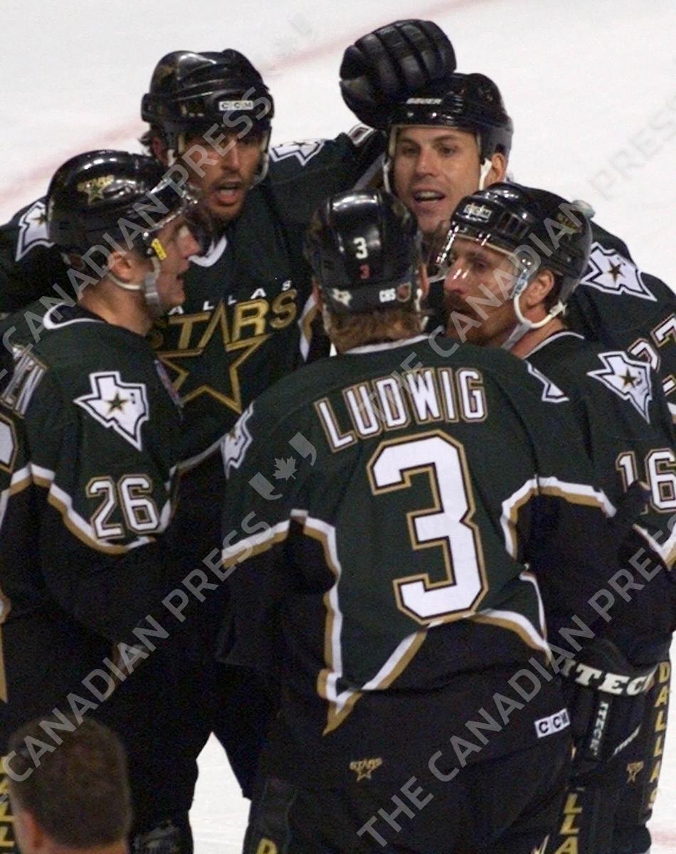 Dallas Stars (clockwise from top left) Mike Modano, Shawn Chambers, Pat Verbeek, Craig Ludwig and Jere Lehtinen celebrate Lehtinen's first period goal in game six of the Stanley Cup finals in Buffalo, N.Y., Saturday June. 19, 1999. The Stars lead the series 3-2. (CP PHOTO/Ryan Remiorz)