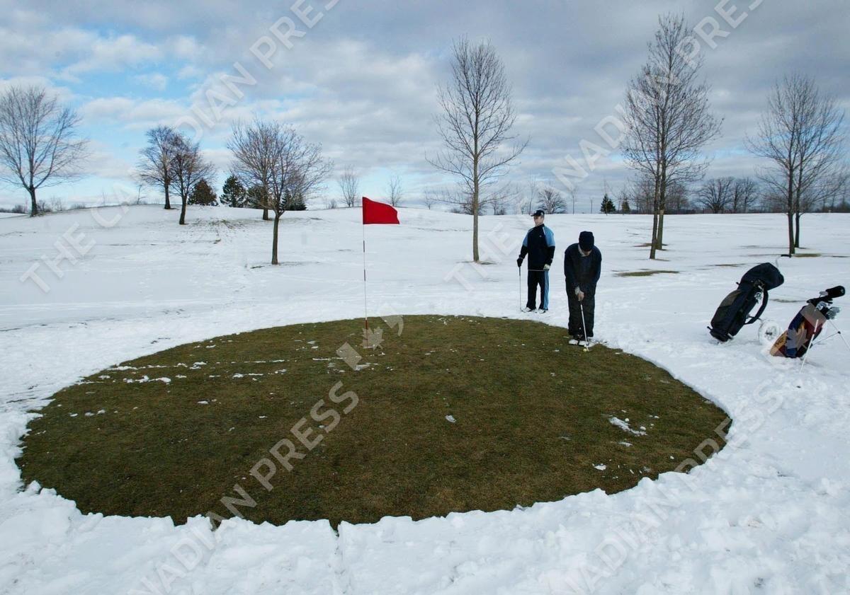 Lance Syme putts on the ninth green as brother Charles looks on while winter golfing at the Tam O'Shanter Golf Course in Toronto Sunday, December 29, 2002. Golfers, who pay regular green fees to play in the winter, use coloured golf balls to help them find them in the white snow. It is the first year the course has offered winter golfing. (CP PHOTO/Kevin Frayer)
