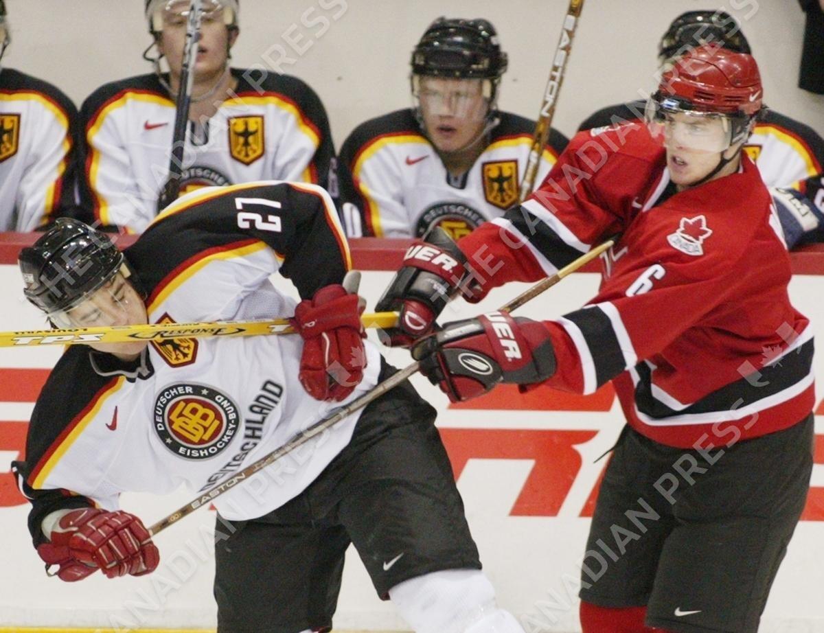 Canada's Nathan Paetsch, right, checks Germany's Max Seyller in third period action at the World Junior Hockey championship in Halifax, Nova Scotia, on Sunday, Dec. 29, 2002. Canada won 4-1.(CP PHOTO/Andrew Vaughan)