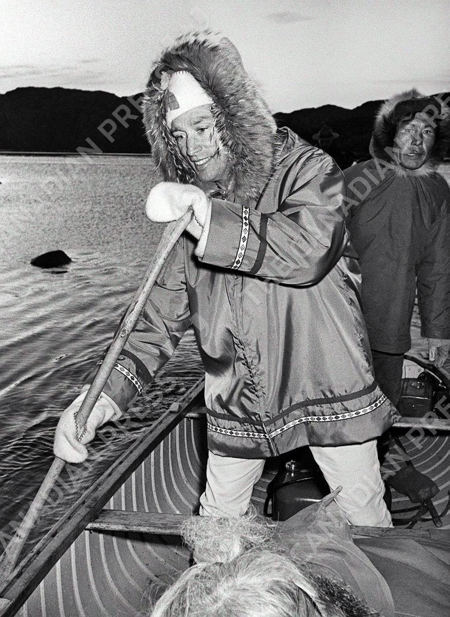 Prime Minister Trudeau helps paddle a canoe Friday July 28, 1968, in the waters off Baffin Island's Clearwater Fiord. (CP PHOTO/ Peter Bregg)