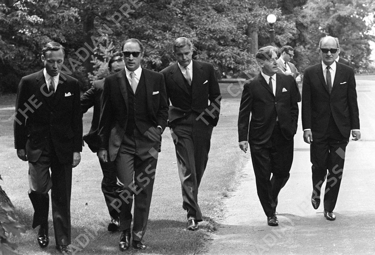 (OTT2) OTTAWA, July 6--ARRIVE FOR SWEARING IN--Prime Minister Pierre Trudeau (second from left) wearing dark glasses, arrives with members of his new cabinet for swearing in ceremonies at Government House in Ottawa Saturday. Left to right are: James Richardson, minister without portfolio; D.C. Jamieson, (partly hidden), minister without portfolio; Mr. Trudeau; Justice Minister John Turner; Jean Marchand, Forestry Minister; Gerard Pelletier, State Secretary. (CP PHOTO) 1968 (Stf-Doug Ball)