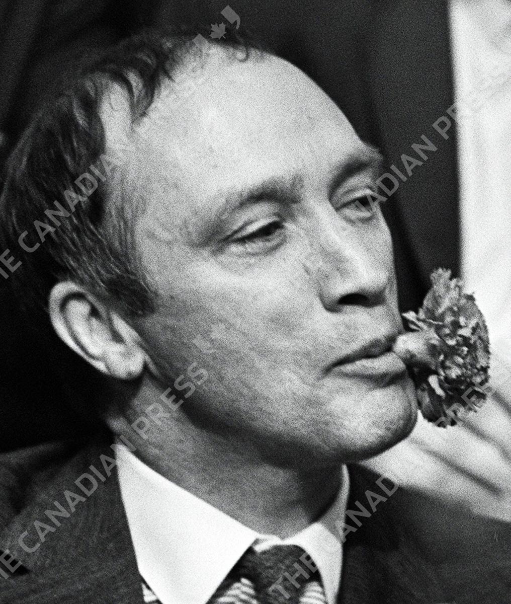 Pierre Elliott Trudeau was elected leader of the Canadian Liberal Party in this April 7, 1968 photo. Trudeau kids around with a carnation while waiting for voting results. (CP PHOTO) 1997 (Stf Chuck Mitchell)
