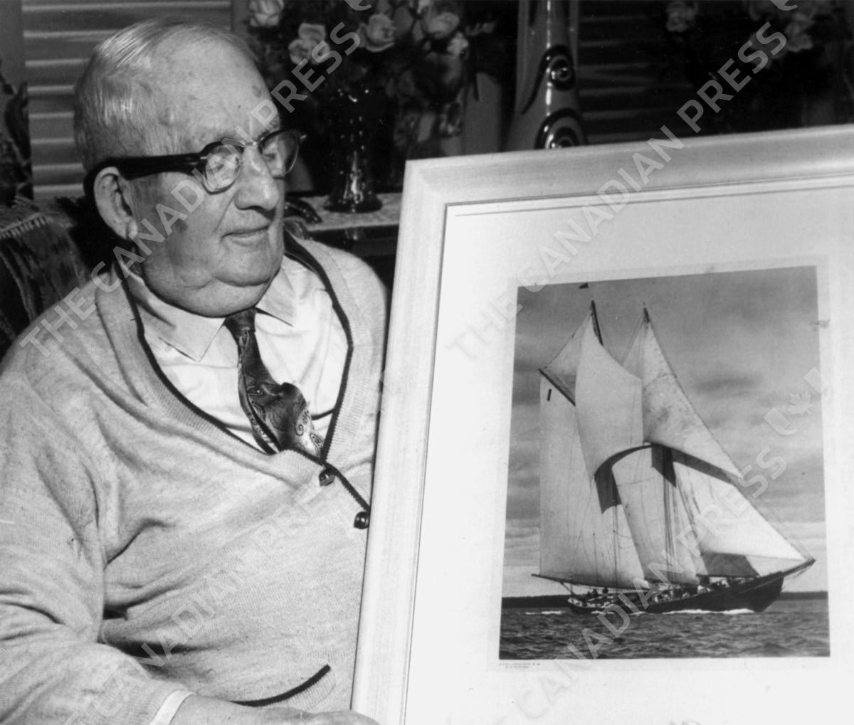 Capt. Angus Walters, renowned skipper of the schooner Bluenose, died in hospital early August 12, 1968 at his hometown of lunenburg, N.S. He was 87. Here he is shown on the eve of his 86th birthday holding a photograph of the original Bluenose. (CP PHOTO)