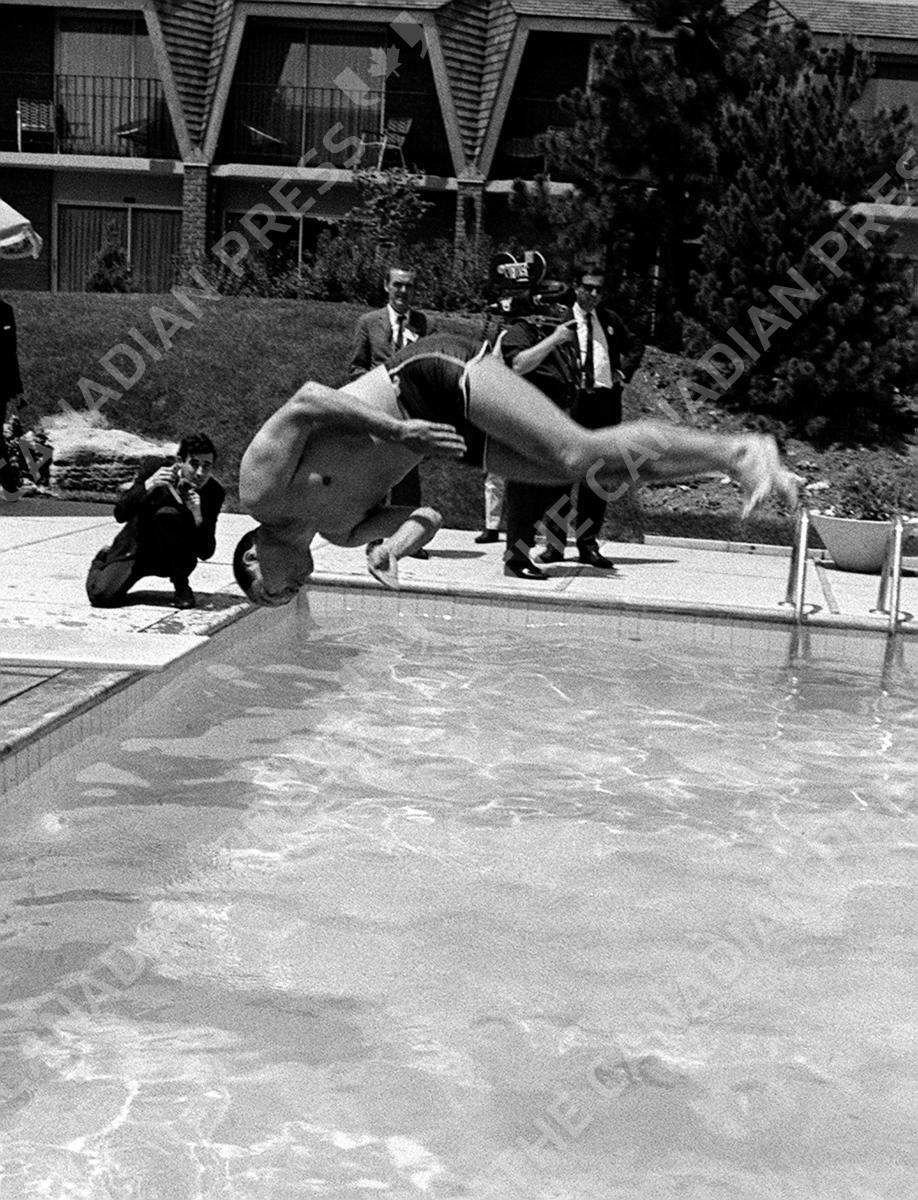 Prime Minsiter Pierre Trudeau heads towards water in less than perfect style during what he called a Douglas dive while good-naturedly spoofing his political opponents in the election race, June 15, 1968. (CP PHOTO/ Joe Horigan)