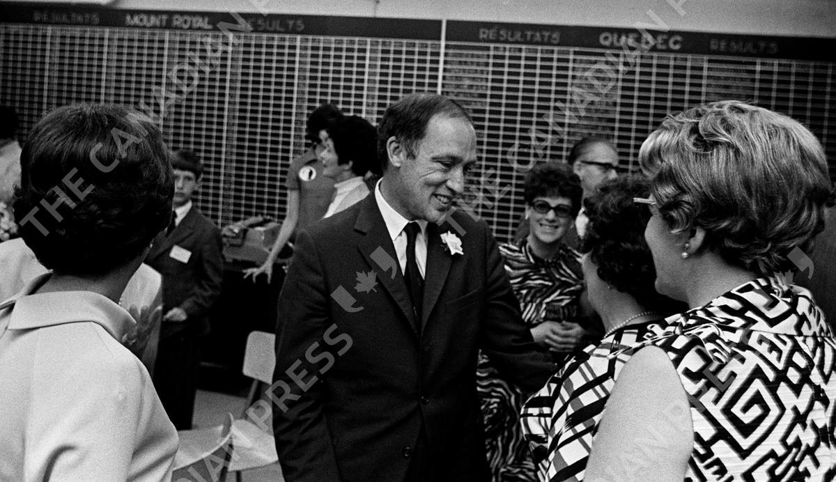 Prime Minsiter Pierre Trudeau talks to party workers at his headquarters in the Montreal riding og Mount Royal, June 25, 1968. (CP PHOTO/ Chuck Mitchell)
