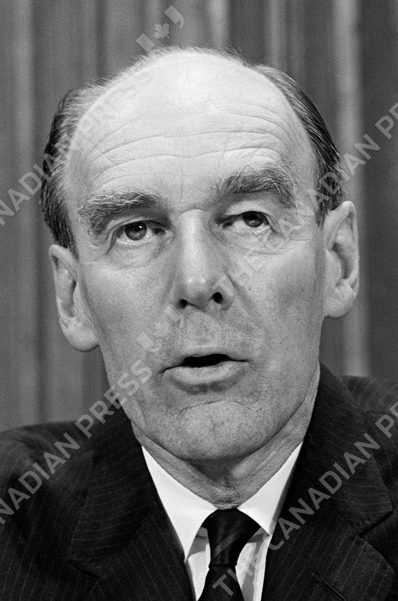 Nova Scotia Premier Robert Stanfield, one of nine candidates for the national leadership of the Progressive Conservative party told reporters at an Ottawa press conference he favored increased foreign aid and more trade with newly developing countries, August 14, 1967. (CP PHOTO/ Chuck Mitchell)