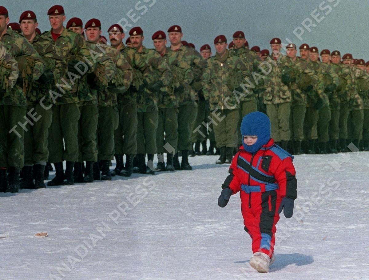 Two-year-old Cameron Gravelle marches alongside members of the Canadian Airborne Regiment following their last parachute jump at CFB Petawawa Mar. 4, 1995. Cameron's Father was among the over 600 members who ,made one final mass jump before being disbanded.(CP PHOTO/ Tom Hanson)