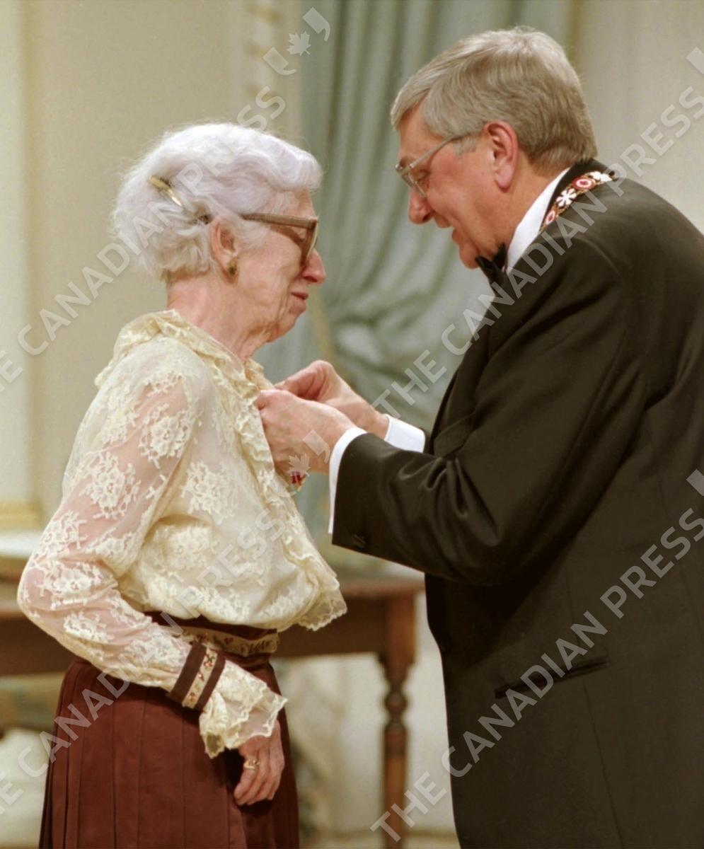 Governor General Romeo LeBlanc invests Ellen Fairclough as Companion to the Order of Canada in Ottawa in this 1995 file photo. Fairclough, Canada's first female cabinet minister, has died at age 99. (CP PHOTO - Fred Chartrand)