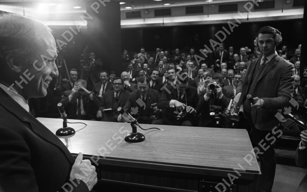 Ottawa - February 16, 1968 - Justice Minister Pierre Elliott Trudeau announces his candidacy for the leadership of the Liberal Party at the National Press Club. (CP/Chuck Mitchell)