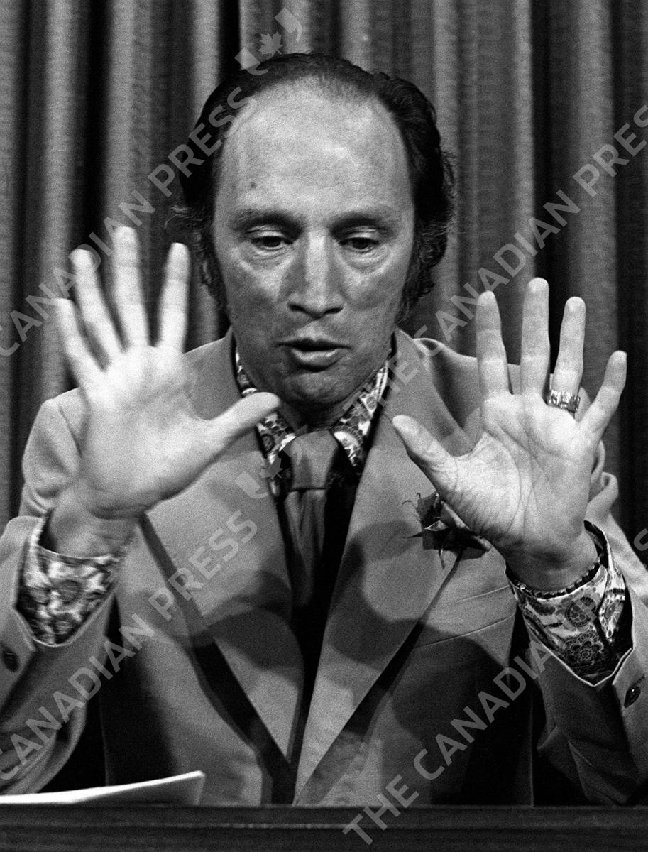 Prime Minister Trudeau takes on an animated pose as he answers reporters' questions during a news conference in Ottawa Friday night, Sept. 1, 1972. Mr Trudeau announced a federal election for Oct. 30. (CP PHOTO/ Charles Mitchell)