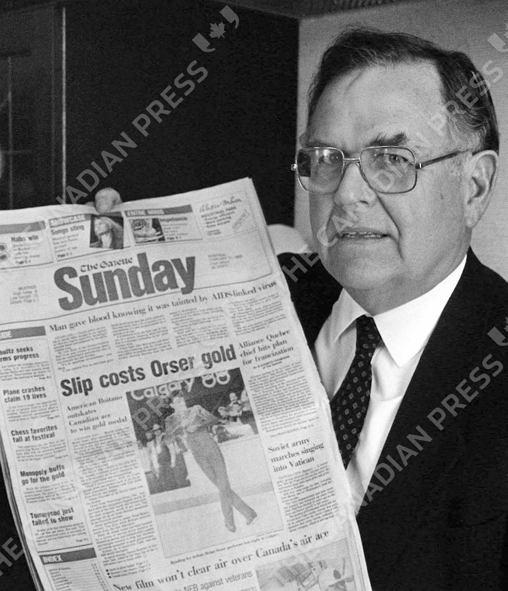 Clark W. Davey, publisher of the Montreal Gazette, displays a dummy of the new Sunday edition Feb. 26, 1988 which will be launched Sunday Feb. 28, 1988. (CP PHOTO/Bill Grimshaw)