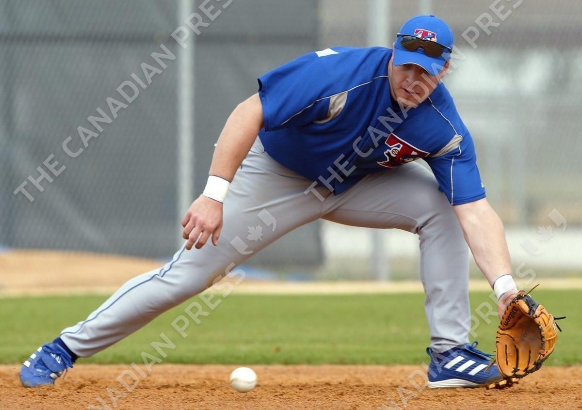 Toronto Blue Jays third baseman Eric Hinske fields a ground ball at the team's spring training camp in Dunedin, Fla. on Tuesday Feb. 25, 2003. (CP PHOTO/Frank Gunn)