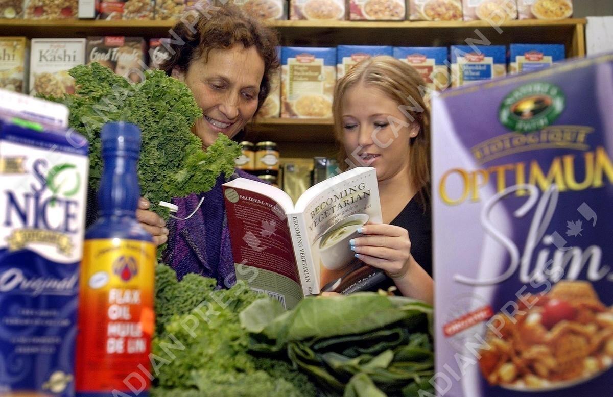 'Becoming Vegetarian' author Vesanto Melina, left, speaks with teen Alanna Brousseau as they look over vegetarian items in Toronto on Tuesday April 8, 2003. Because they are following peer pressure or a have a sensitivity to animals, some teens simply stop eating meat. But they don’t follow a nutritional vegetarian plan that emphasizes more protein, complex carbohyrates and iron. (CP PHOTO/Aaron Harris)