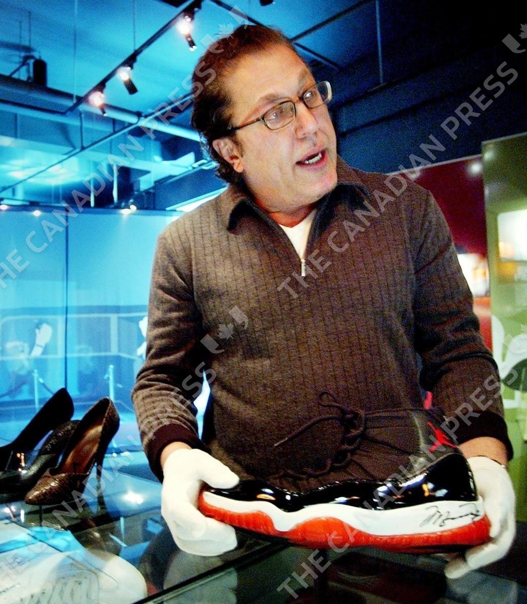 Podiatrist Hartley Miltchin, holds a sample from his celebrity shoe collection, one of Michael Jordan's sneakers, which are on display at the Bata Shoe Museum in Toronto on Wednesday, March 26, 2003. Hartley currently owns over 200 pairs of celebrity worn shoes. (CP PHOTO/J.P. Moczulski)