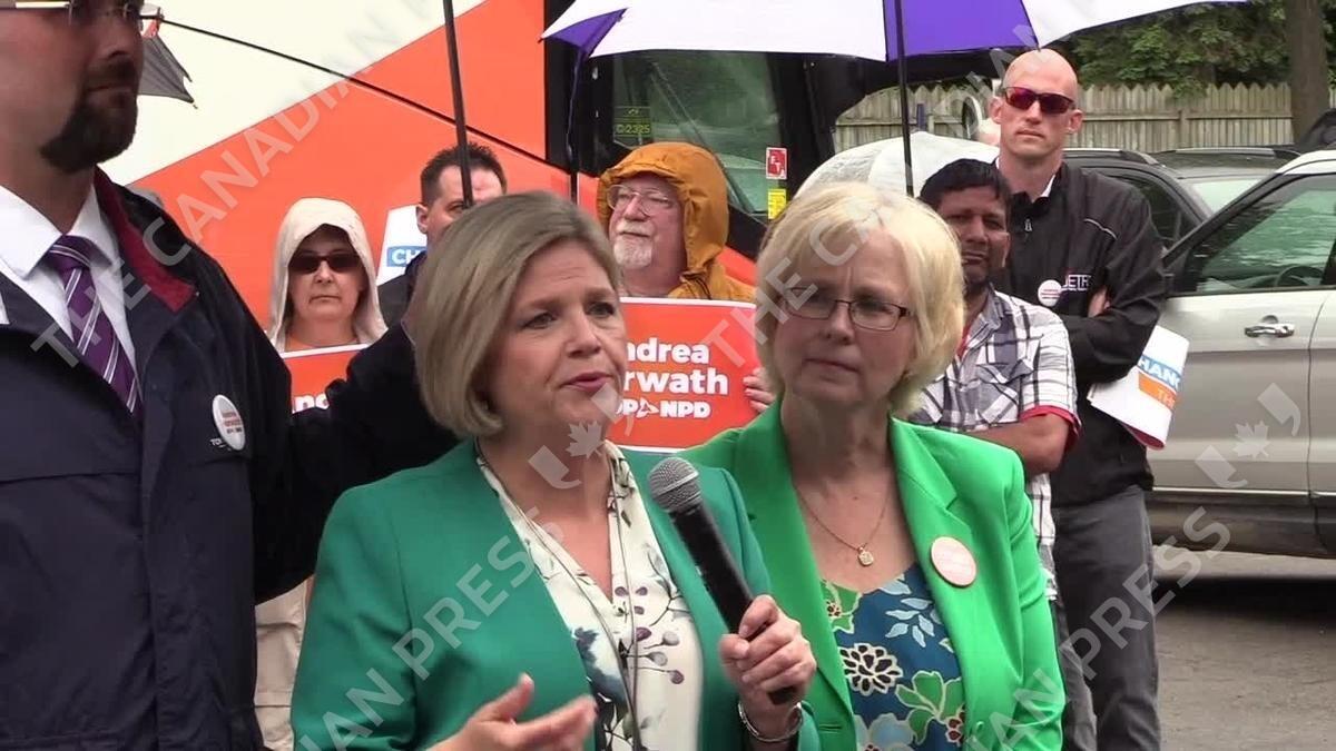 Ontario NDP Leader Andrea Horwath answers questions at campaign stops in London and Chatham, Ont., on June 4, 2018, addressing PC candidates under investigation and Premier Kathleen Wynne's comments that she does not expect to win the election. SOUNDBITE: Ontario NDP Leader Andrea Horwath. PLACELINE: London, Ontario and Chatham, Ontario. LANGUAGE: English NOTE: Contains two clips separated by slates.