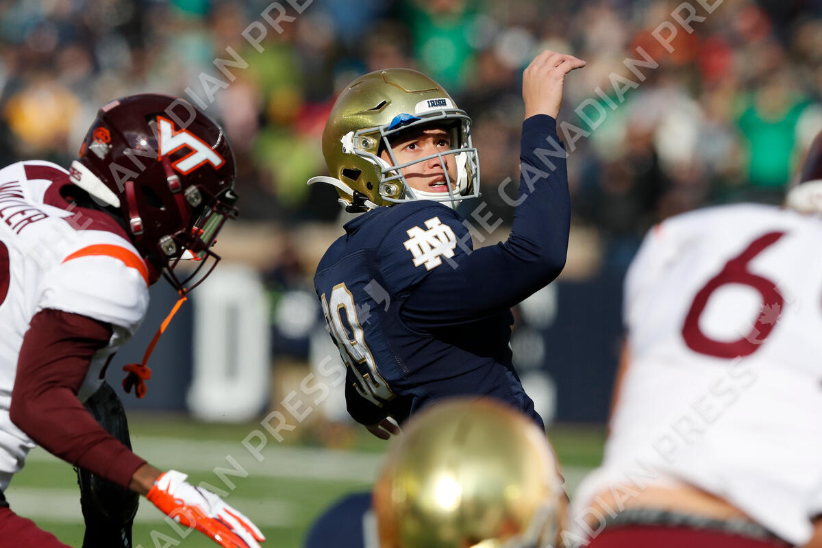Notre Dame place kicker Jonathan Doerer kicks during the first half of an NCAA college football game, Saturday, Nov. 2, 2019, in South Bend, Ind. Doerer pays careful attention to the nuances of his stance, swing path and ball contact — and not just in football. Notre Dame’s senior kicker also frequents the driving range, a habit that only increased when he was home in Charlotte for the spring and summer. (AP Photo/Carlos Osorio)