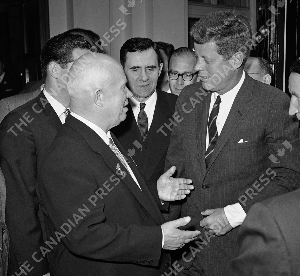 FILE - In this June 4, 1961 file photo, Soviet Premier Khrushchev gestures with both hands as he greets President John Kennedy on Kennedy's arrival at Soviet Embassy in Vienna. At center is Soviet Foreign Minister Andrei Gromyko. Although the moment, protagonists and locations become enshrined in history books, major summits hold no guarantee of further progress. In some cases, the summit is as good as it gets as relations remain stagnant or plummet further. (AP Photo, File)