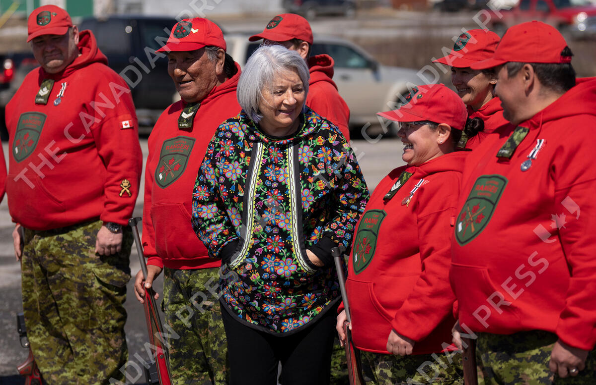 Governor General Mary Simon speaks with Canadian Rangers on parade for her visit Monday, May 9, 2022 in Kuujjuaq, Que. THE CANADIAN PRESS/Adrian Wyld
