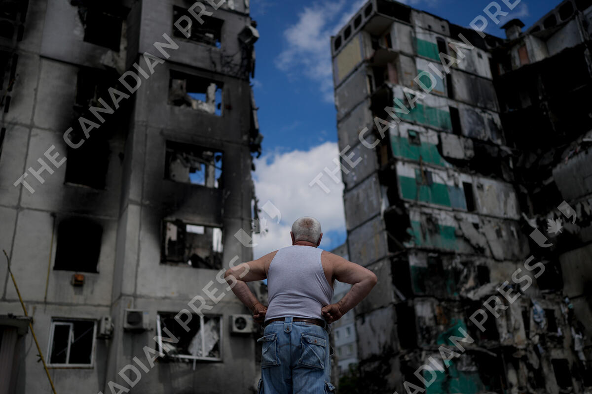A man stands looking at a building destroyed during attacks, in Borodyanka, on the outskirts of Kyiv, Ukraine, Saturday, June 4, 2022. (AP Photo/Natacha Pisarenko)