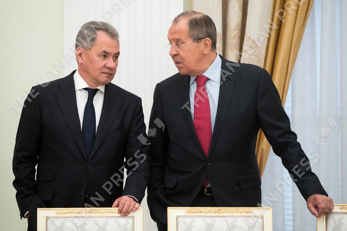 FILE - Russian Defense Minister Sergei Shoigu, left, and Foreign Minister Sergey Lavrov talk at the Kremlin, in Moscow on May 30, 2017. (AP Photo/Pavel Golovkin, Pool, File)