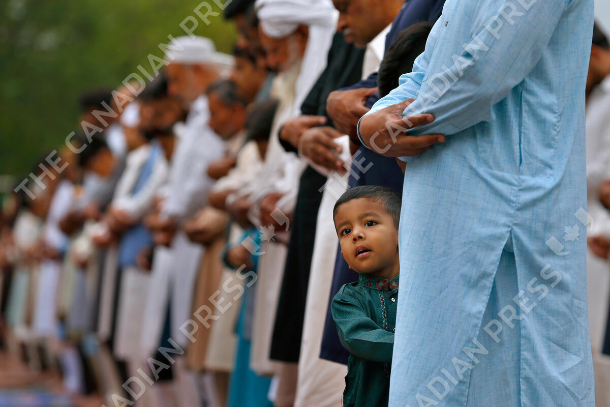 A Muslim boy plays next to his father offering an Eid al-Fitr prayer, marking the end of the fasting month of Ramadan, in Rawalpindi, Pakistan, Tuesday, May 3, 2022. (AP Photo/Anjum Naveed)