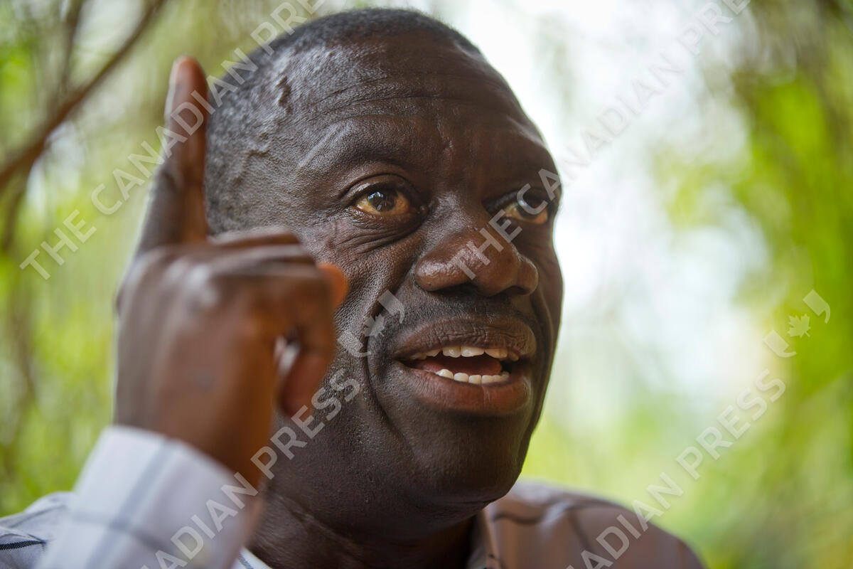 FILE - Opposition politician and then presidential candidate Kizza Besigye speaks to the media while under house arrest, at his home in Kasangati, outside the capital Kampala, in Uganda on Feb. 21, 2016. Besigye, a four-time presidential candidate who has been calling for street protests against rising commodity prices, has been unable to leave his home since May 12, 2022 with police pitching camp nearby to enforce his apparent house arrest. (AP Photo/Ben Curtis, File)