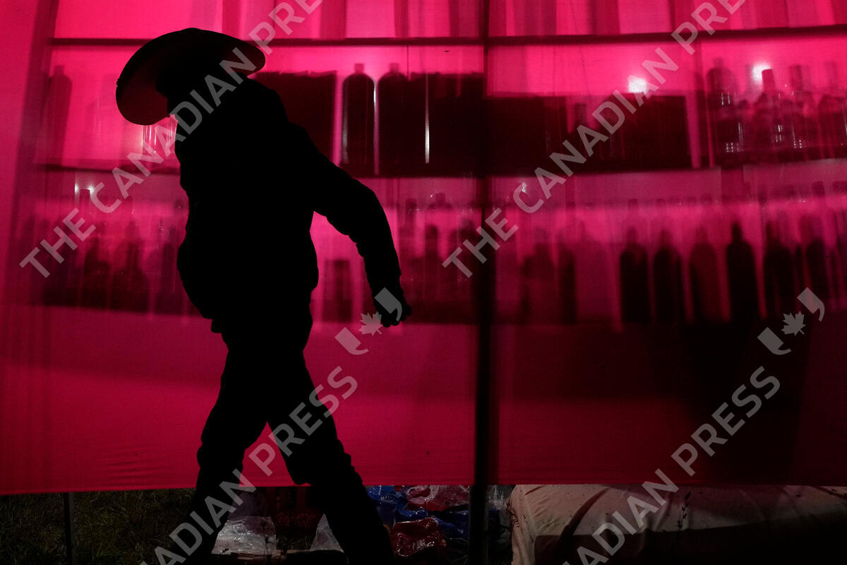 A man walks past liquor bottles silhouetted against a red cloth during the grand dance of the religious tradition, "Folia do Divino Espirito Santo" or Feast of the Divine, in the rural area of Pirenopolis, state of Goias, Brazil, Saturday, May 28, 2022. The event celebrates the coming of the Holy Spirit to Jesus' apostles after his crucifixion and has been performed for two centuries since it was first brought to Brazil by Portuguese colonizers. Once there, it was influenced by the cultures of Indigenous people and Black slaves. (AP Photo/Eraldo Peres)